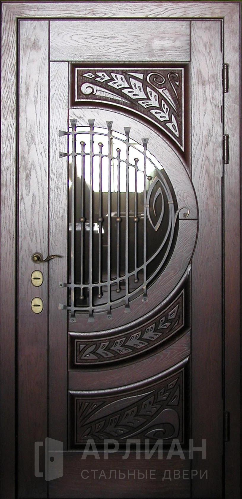 Двухстворчатая входная дверь со стеклом и ковкой №9